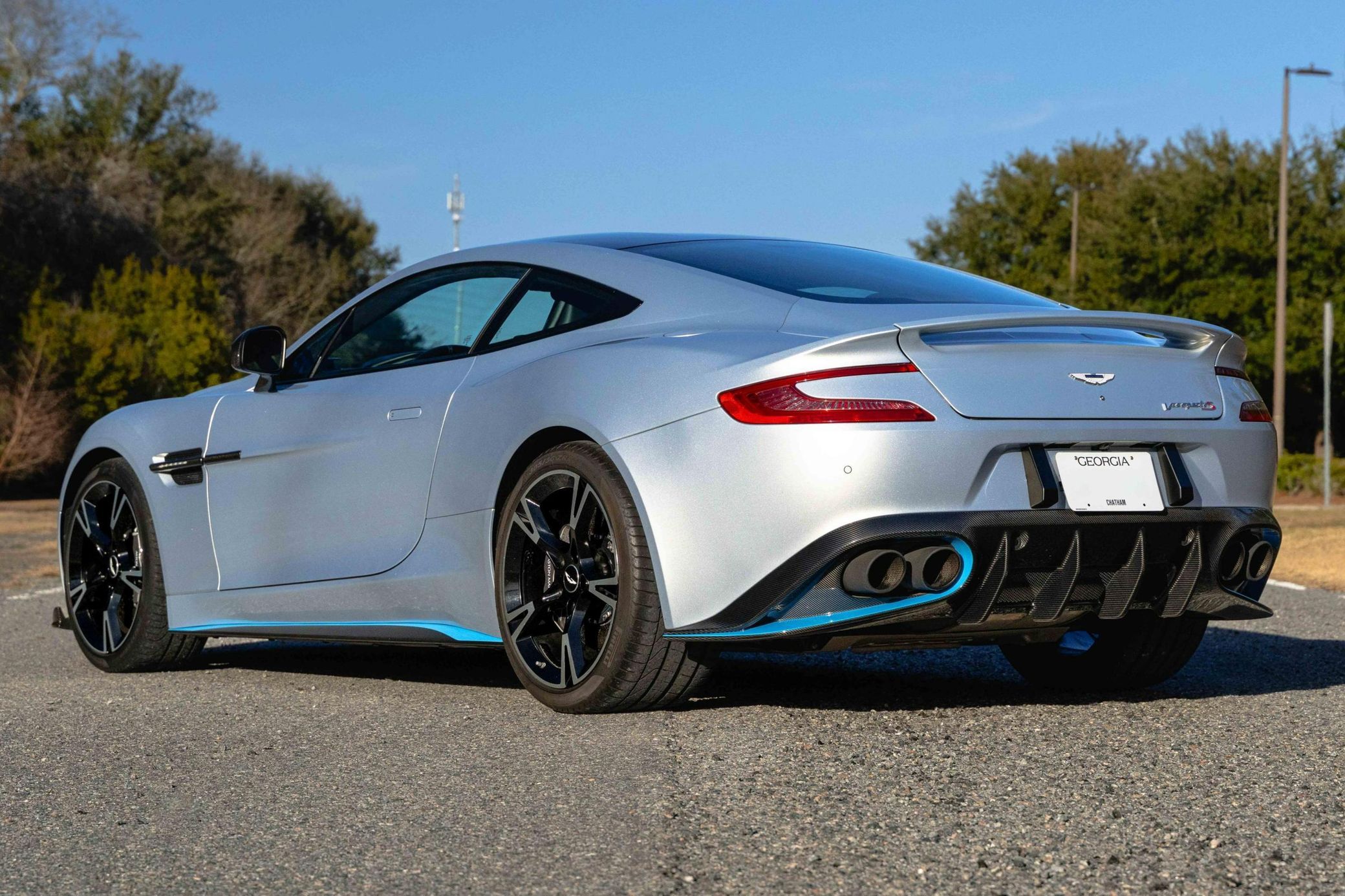 This Vanquish is an S model. A digital window sticker is provided in the photo gallery, and a partial list of notable equipment reported by the seller includes: Full Graphics Pack (Flugplatz Blue accents) 20-inch 5-spoke Gloss Black diamond-turned lightweight wheels Carbon ceramic brakes Carbon fiber roof panel Full length satin chopped carbon on facia Filograph Quilting leather upholstery Bang & Olufsen BeoSound audio system